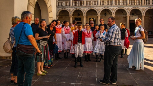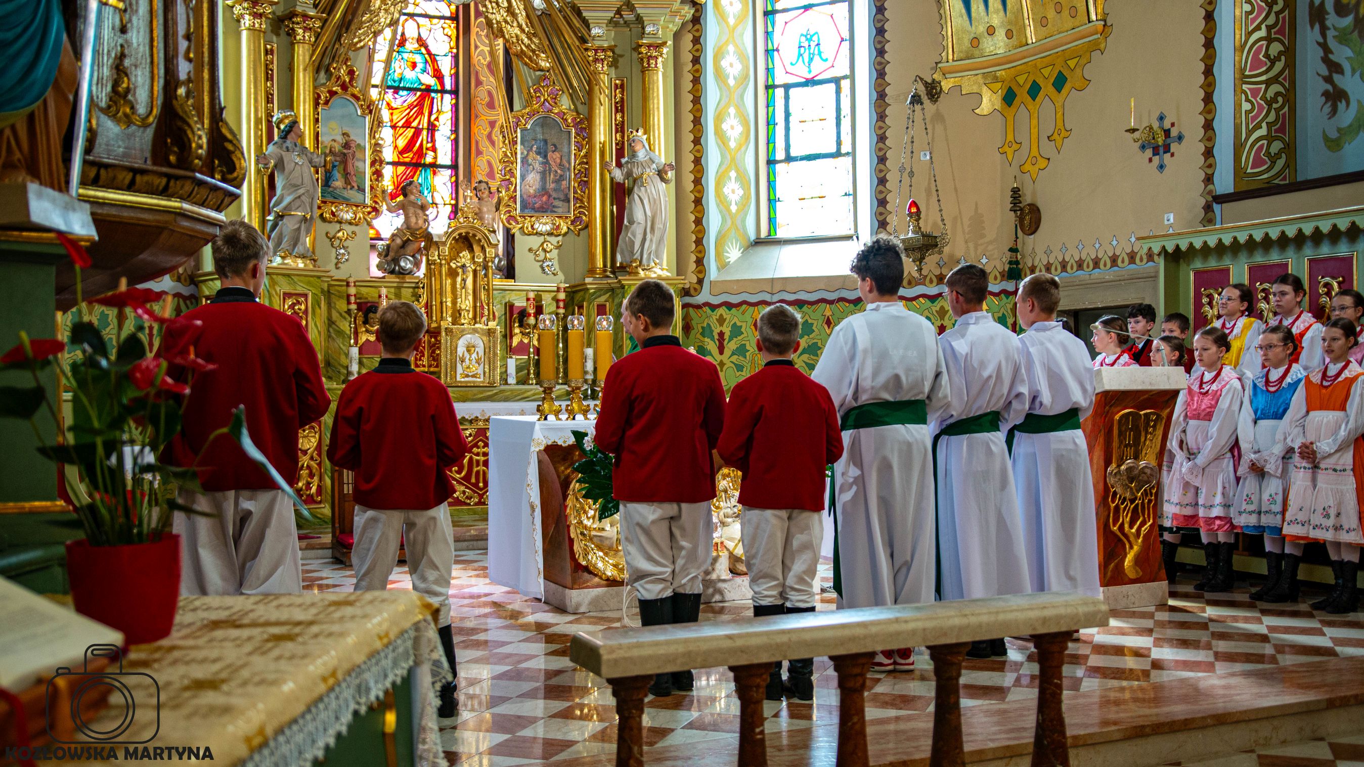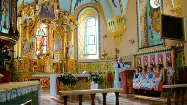 Niedziela to dzień naszego festiwalowego debiutu. Zaczęło się wcześnie – już o 8 mieliśmy śniadanie, a po nim Mszę świętą w miejscowym kościele. Razem z Zespołem Regionalnym „Mała Istebna” ubogaciliśmy liturgię naszymi strojami i śpiewem.