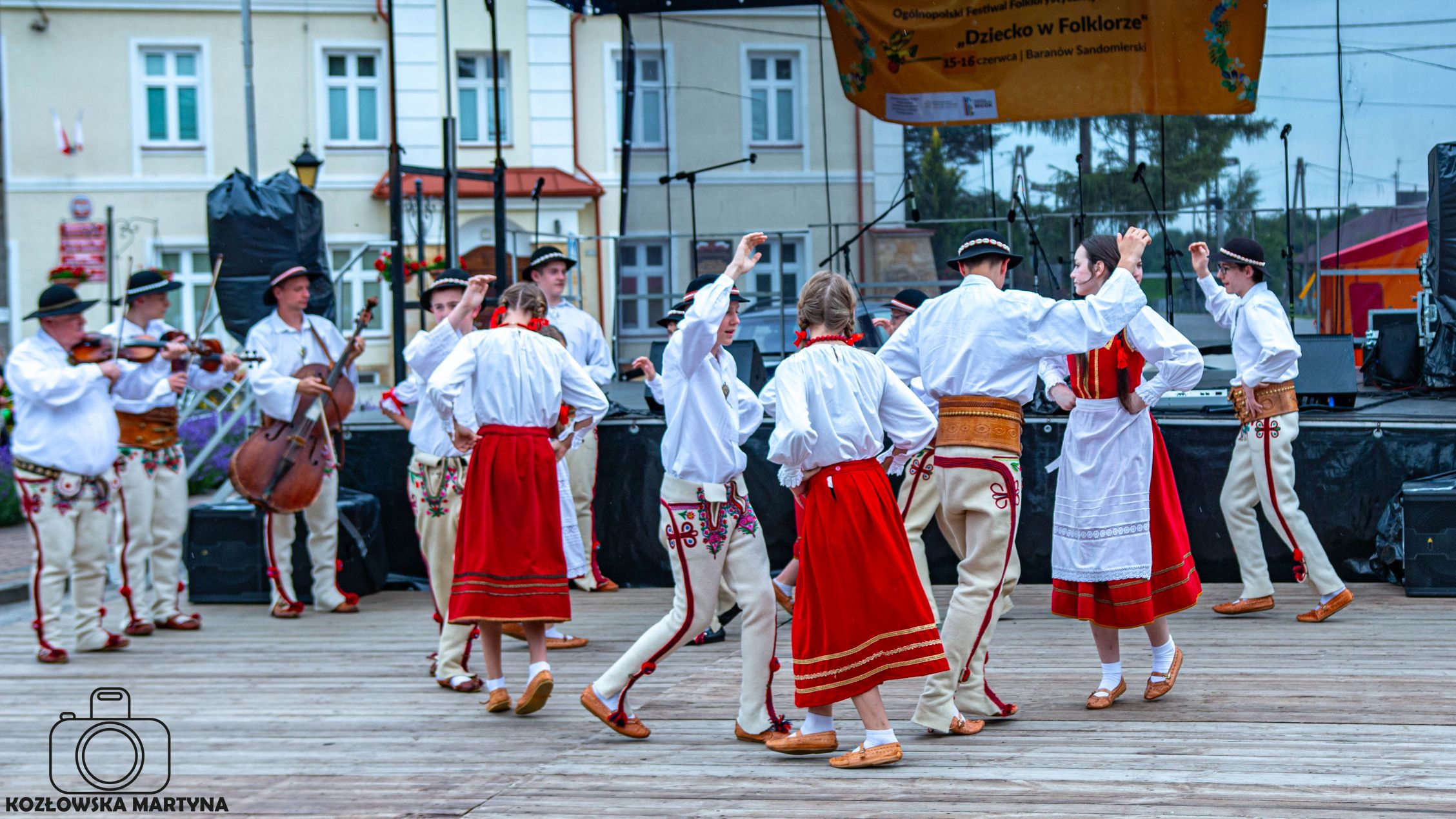 Sobotę rozpoczęliśmy próbą, a zaraz po niej udaliśmy się do Ośrodka Kultury na otwarcie festiwalu. Obejrzeliśmy pierwszych wykonawców, poszliśmy na obiad do remizy, a następnie w strojach wielkopolskich do baranowskiego Zamku. Nie bylibyśmy oczywiście sobą, gdybyśmy nie skorzystali z okazji i nie zatańczyli na dziedzińcu. Wielkopolskie melodie popłynęły z akordeonu i nasza niezawodna ekipa zatańczyła fragment konkursowego układu wzbudzając niemałe zainteresowanie wśród osób odwiedzających zamek. Nie był to jednak koniec sobotnich atrakcji, o 21:00 czekało na nas bowiem na miejscowym stadionie lekkoatletycznym kino plenerowe.