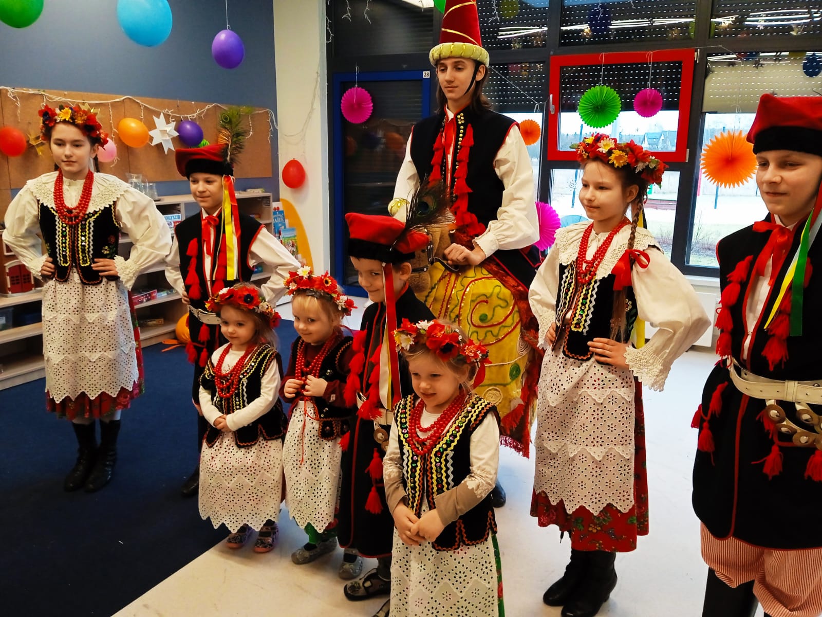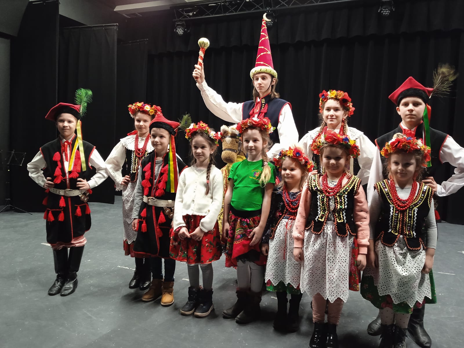 Rozpoczęliśmy piosenką „Krakowiaczek jeden”, a jedni z naszych młodszych tancerzy: Martyna, Faustyna, Wojtek i Kajtek radośnie ruszyli w tan. Skocznie, z wielkim wdziękiem i uśmiechem pokazywali swoim młodszym kolegom i koleżankom cwały, kulawe, hołubce i inne figury krakowiaka. Niespodzianką dla naszych miłych widzów był Gość specjalny, czyli Lajkonik. Ten znany symbol Krakowa wywołał uśmiech na twarzach nie tylko najmłodszych.