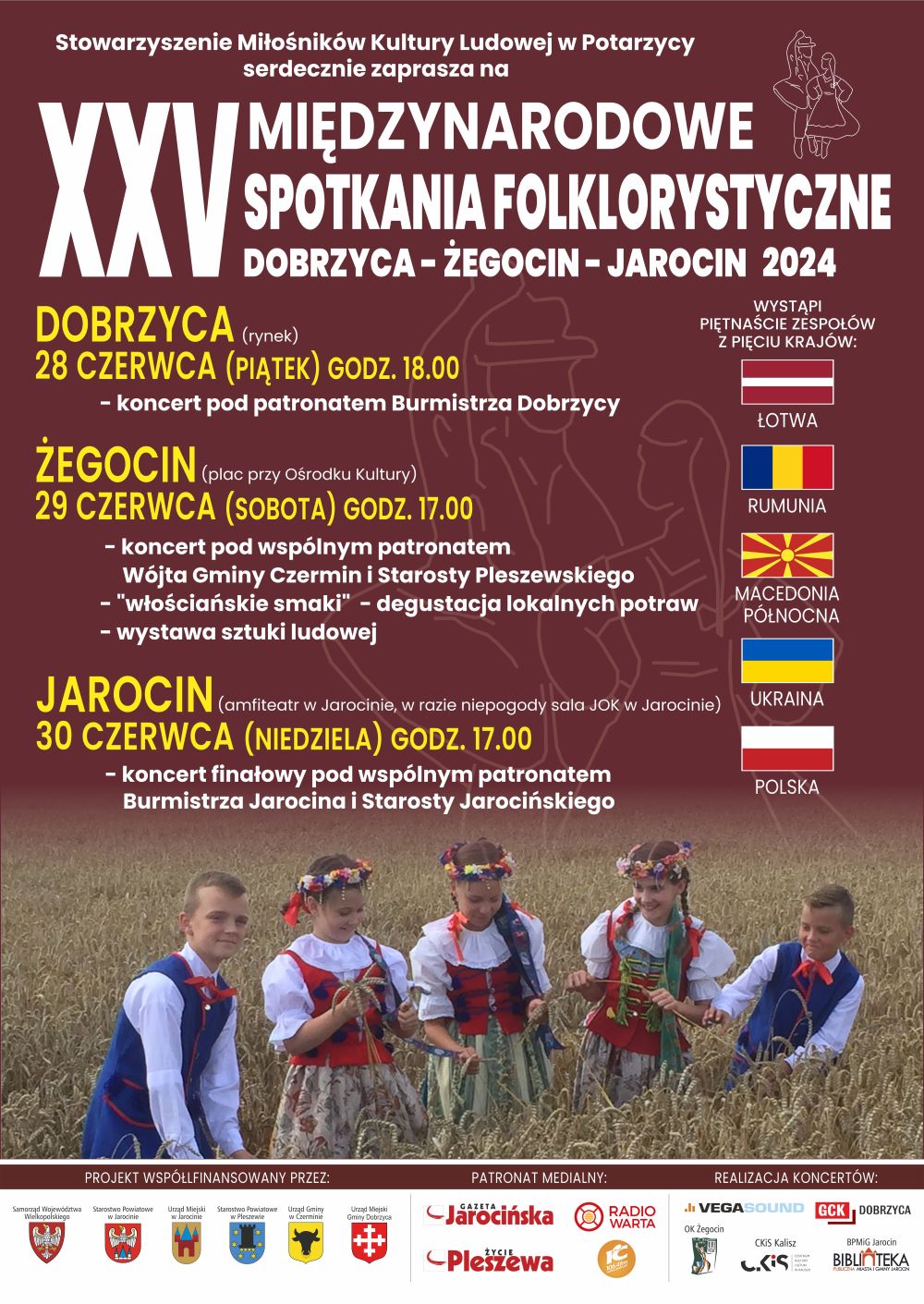 W niedzielę 30 czerwca gościliśmy w Jarocinie na XXV Międzynarodowych Spotkaniach Folklorystycznych. Pomimo kapryśnej pogody – najpierw upału, a później ulewy z gradem – na scenie Jarocińskiego Ośrodka Kultury zaprezentowało się 15 zespołów z Polski, Ukrainy, Rumunii, Macedonii Północnej i Łotwy.