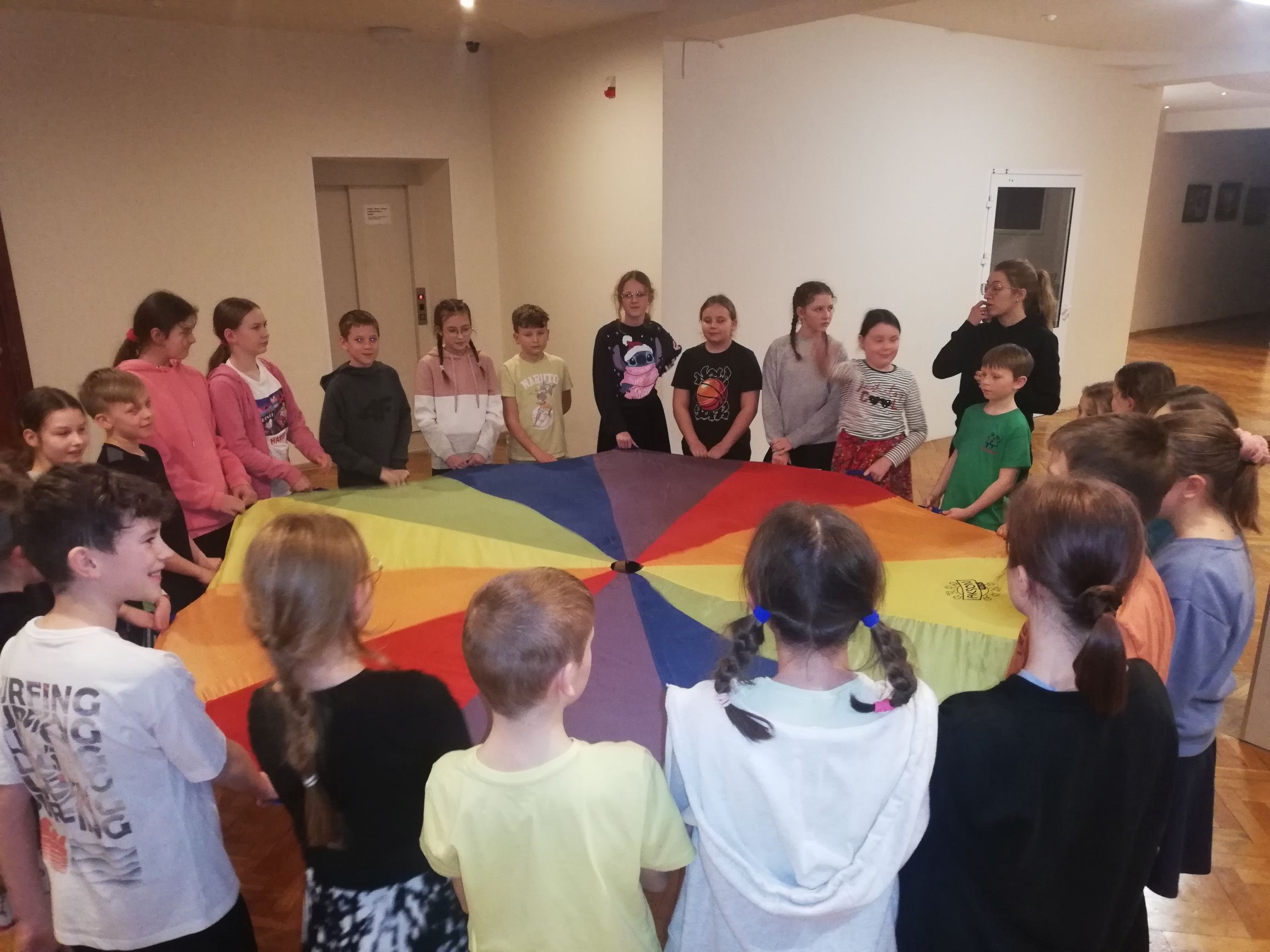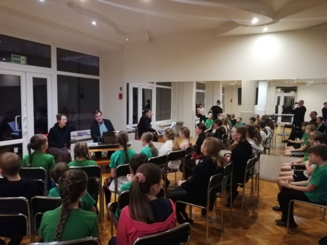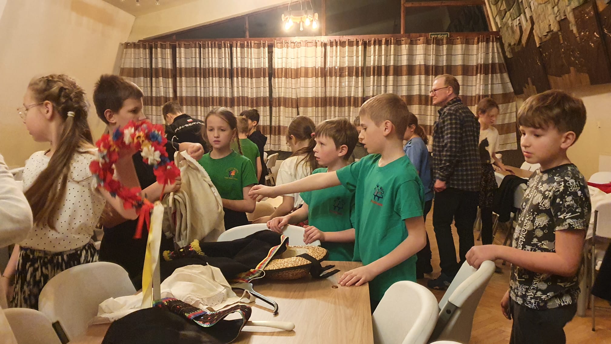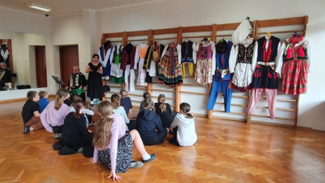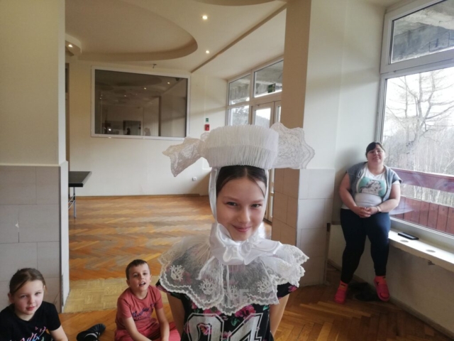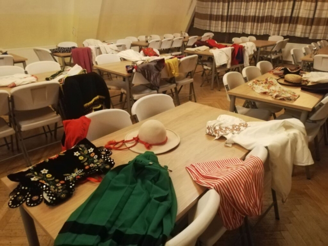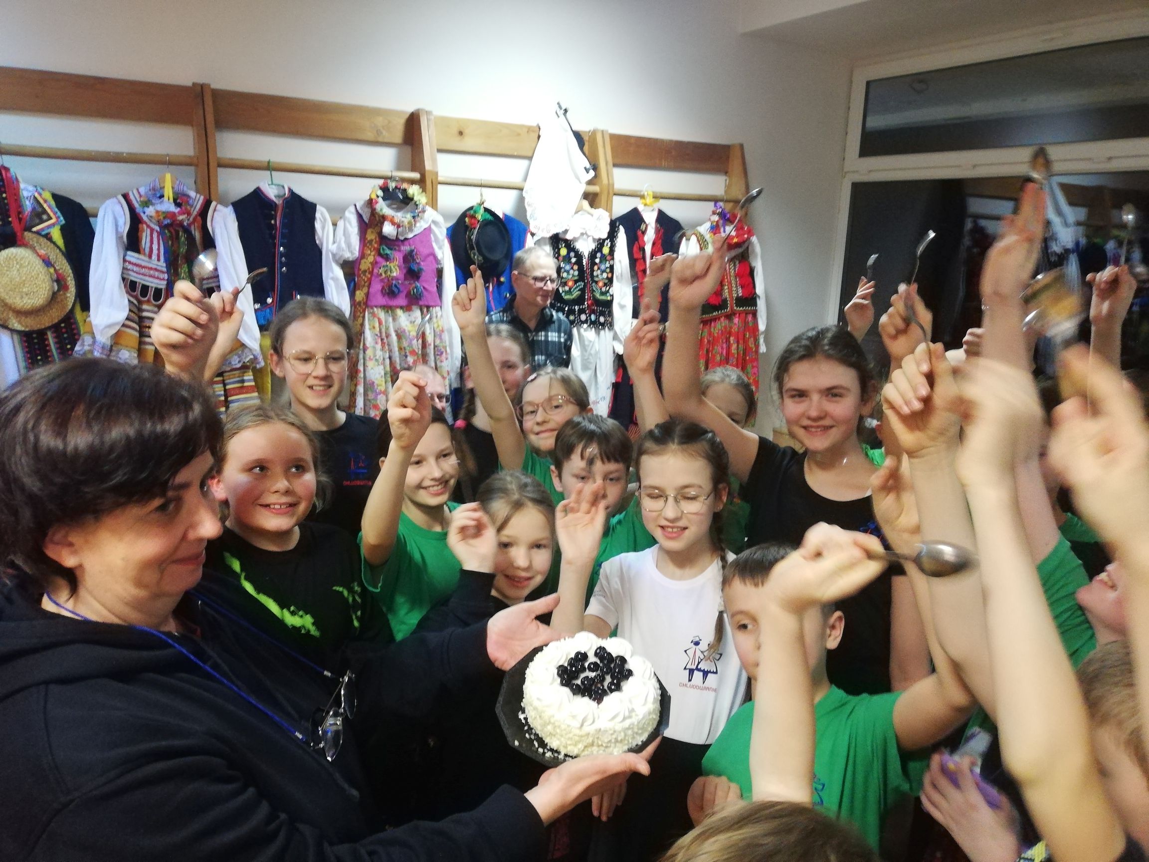 Na obozie nie zabrakło także niespodzianek, konkursów i koncertów. Podczas czwartkowego wieczoru, poza panem Jackiem, była z nami pani Marta, która przywiozła jubileuszowy tort. Po naszym obozowym koncercie zjedliśmy ciasto z wielkim apetytem. W piątek na zakończenie obozu odbył się koncert piosenek, których nauczyliśmy się podczas wyjazdu, a po koncercie miał miejsce specjalny konkurs. Zadanie nie było wcale łatwe, bo musieliśmy w grupach skompletować z pojedynczych elementów aż 12 kompletów strojów. O ile noszony przez nas często śląsk czy krakowiak nie był zbyt trudny, o tyle dopasowanie spodni rzeszowskich, kaszubskich i krzczonowskich okazało się już trochę bardziej skomplikowane. Nie poddaliśmy się jednak i po wspólnej zabawie wszystkie stroje zostały poukładane we właściwy sposób. Wiemy już teraz nie tylko jakie są ich elementy, ale także ile czasu zajmuje ich właściwe przygotowanie do koncertów.