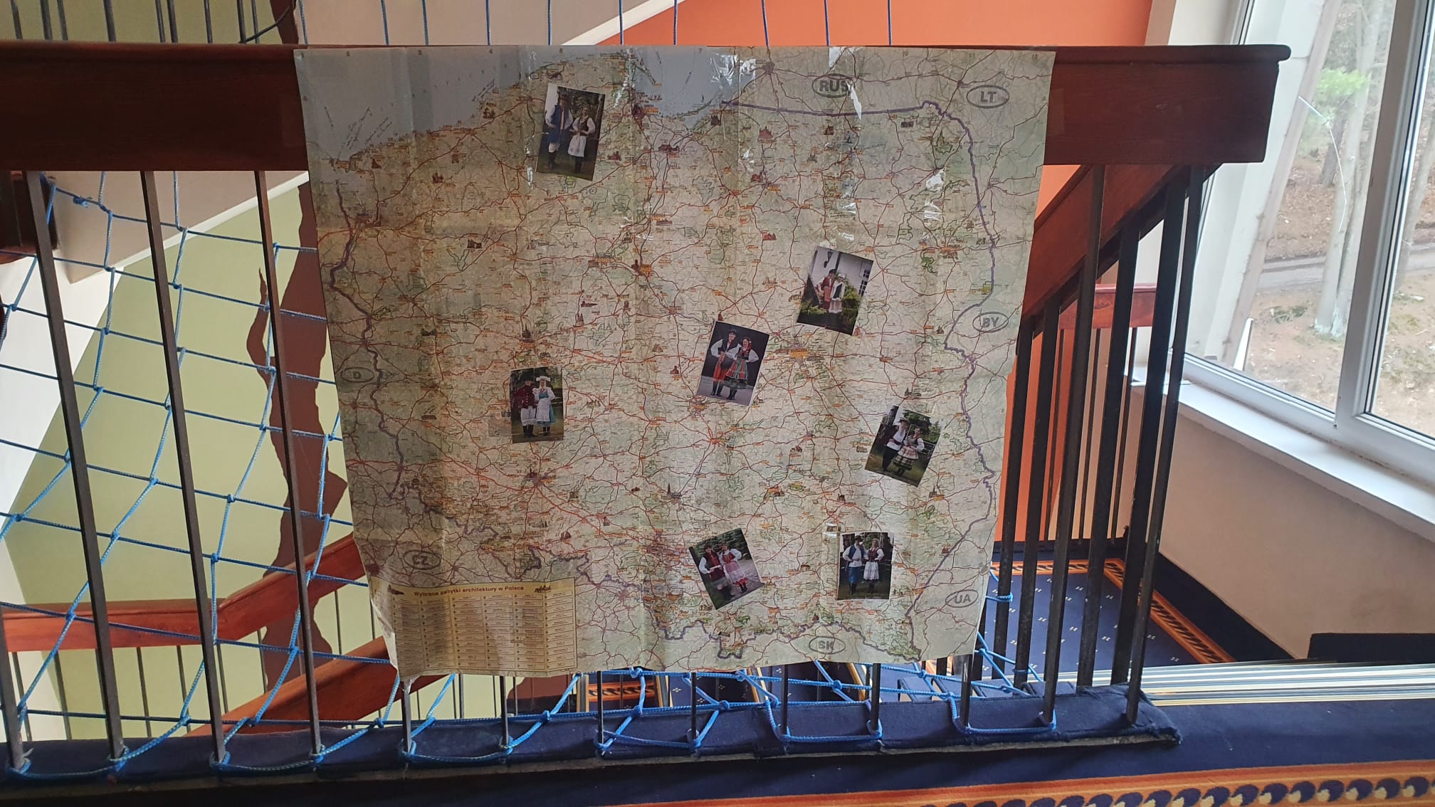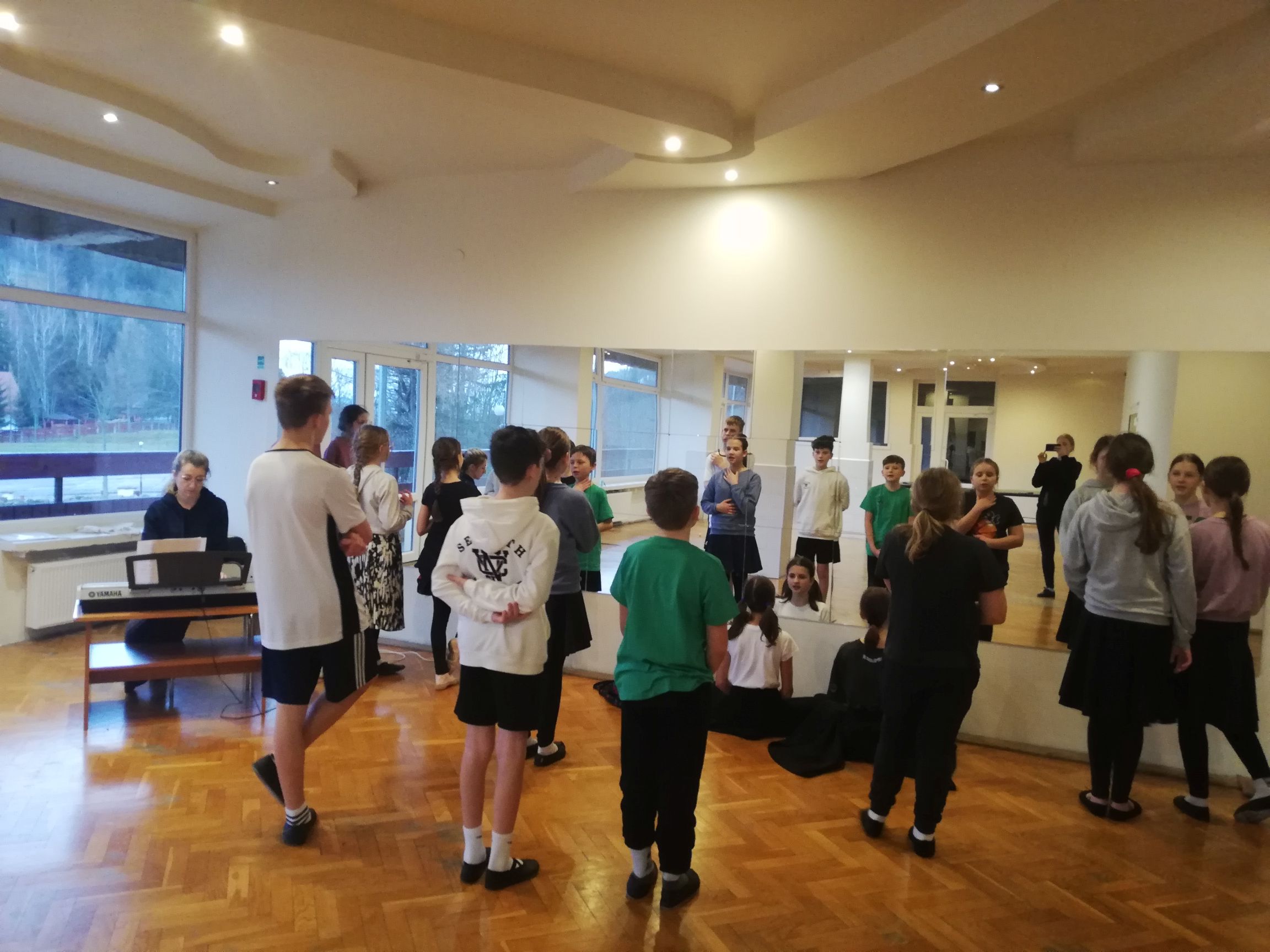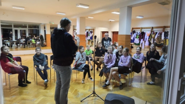 W tym roku nasz obóz odbywał się pod hasłem „Poznajemy nasze stroje i regiony”. Codziennie rano budziły nas dźwięki muzyki, a na drzwiach czekała na nas koperta z fragmentami układanki, w której skrywał się jeden z naszych kostiumów. Po złożeniu puzzli jeden element trafiał na mapę Polski, a drugi na naszą wystawkę ścienną. Poza tym codziennie poznawaliśmy piosenki z danego regionu i uczyliśmy się nowych kroków. Każdego wieczoru, jako podsumowanie, oglądaliśmy fragment koncertu, nawiązujący do tematu dnia. Dzięki tym zadaniom przyswoiliśmy wiedzę bardzo szybko i teraz nasze stroje nie mają przed nami tajemnic. Poza pracą nad regionami szlifowaliśmy oczywiście formę taneczną i wokalną. Z radością na ustach uczestniczyliśmy codziennie w zajęciach, a w międzyczasie pałaszowaliśmy pyszne posiłki i integrowaliśmy się w grupie. W tym roku mieliśmy także okazje do udziału w nietypowych zajęciach. Odwiedził nas pan Jacek Kaczmarski i przeprowadził z nami warsztaty pracy z mikrofonem. Dzięki niemu już wiemy, co zrobić, żeby było nas dobrze słychać podczas koncertów.